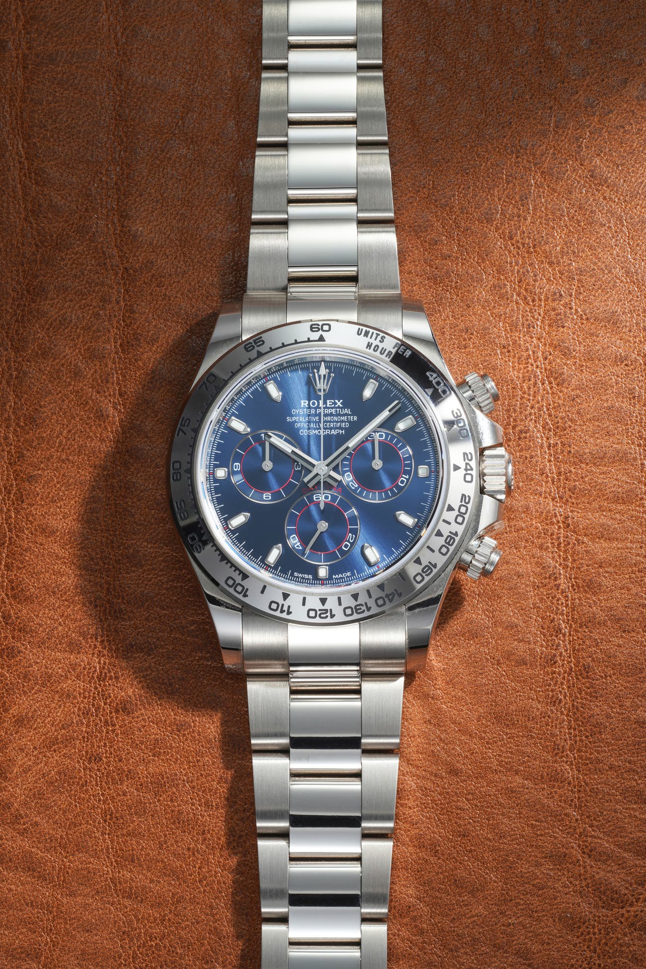 - Crafted entirely in 18k white gold, the watch balances sporty design with refined elegance, powered by Rolex’s in-house chronograph calibre 4130.