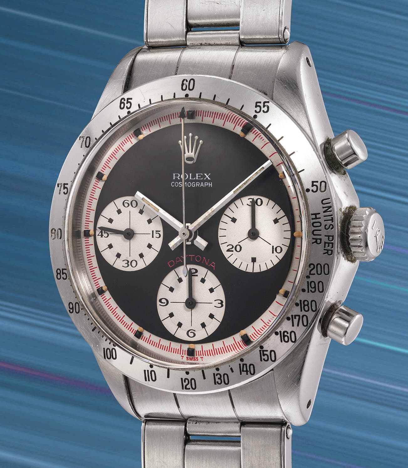 First and foremost, it features one of rarest and most collectible declinations of the “Paul Newman” dial: the so-called “Musketeer” variation. Usually, Paul Newman dials have a concentric circle pattern (azurage) all the way to the edge of the sunken subdials, which present vertical “walls” . However, on Musketeer dials the azurage covers only two-third of the dials; the remaining outer sector is smooth and gently slopes up to the main dial surface: a completely different design than the standard one. The present dial is preserved in outstanding condition with round luminous dots that are intact and have aged with light patina. The outer track has barely any signs of ageing as well which is very rare for this dial variant. Musketeer Paul Newmans appear to occur throughout the 2’xxx’xxx range, with examples sold by Phillips ranging from 2’036’574 to 2’737’249.