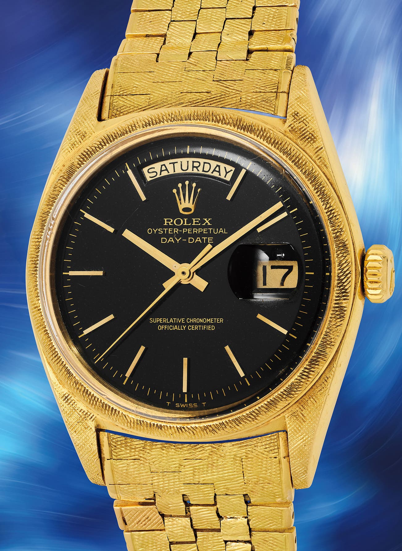 The present Day-Date is a remarkable example with the black lacquered dial and wonderfully textured case and sumptuous, textured link bracelet. The deep gloss finish of the dial integrates with the gold case and bracelet giving the wristwatch a mid-20th century appeal. These rare watches have hand finished cases giving each a slightly different pattern and texture. The present model is well-preserved and a wonderful example of these rare Day-Date timepieces.