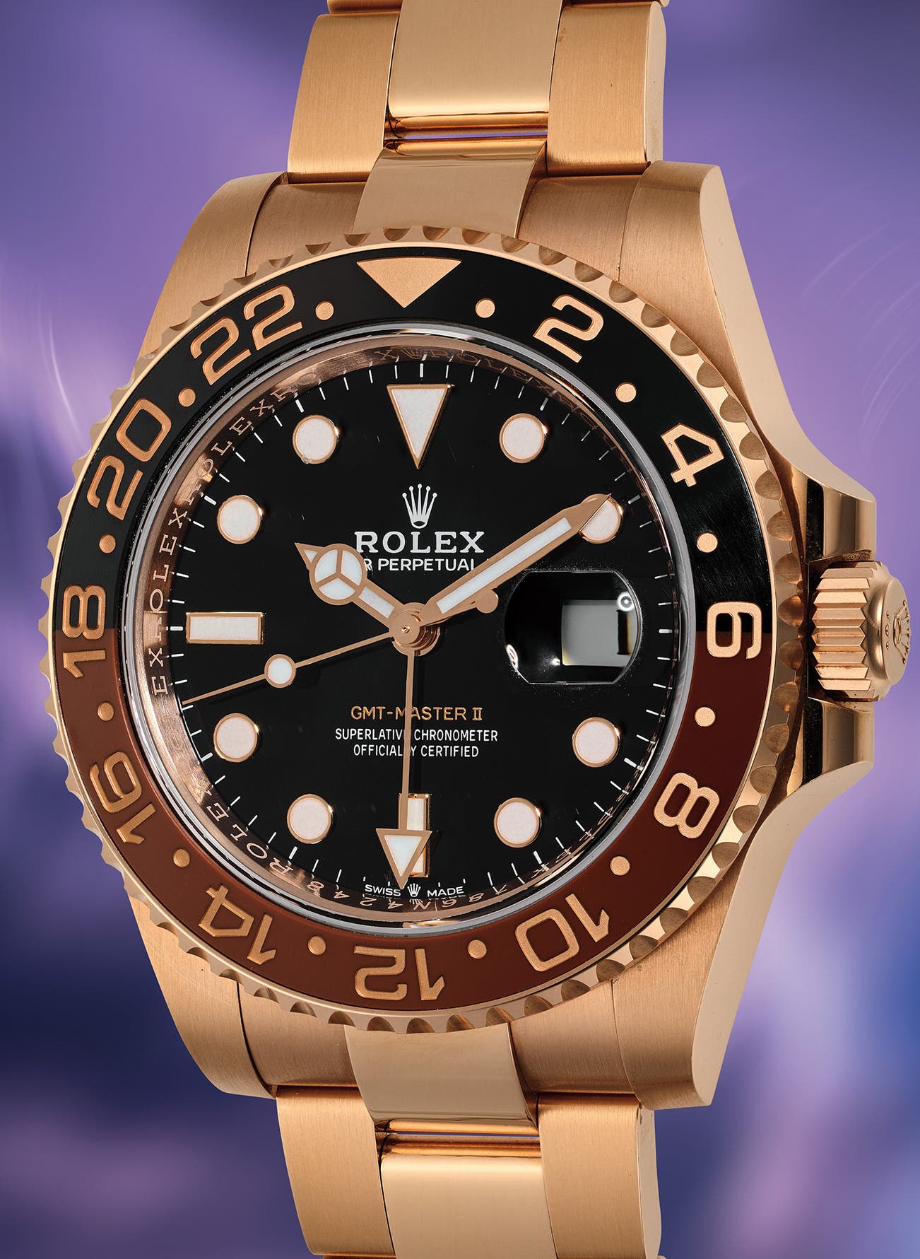 Powered by the Rolex Caliber 3285, the watch offers a 70-hour power reserve and exceptional precision, with dual time zone functionality ideal for frequent travelers. The GMT hand, paired with the 24-hour bezel, allows users to track a second time zone, while the date function is synchronized with local time.