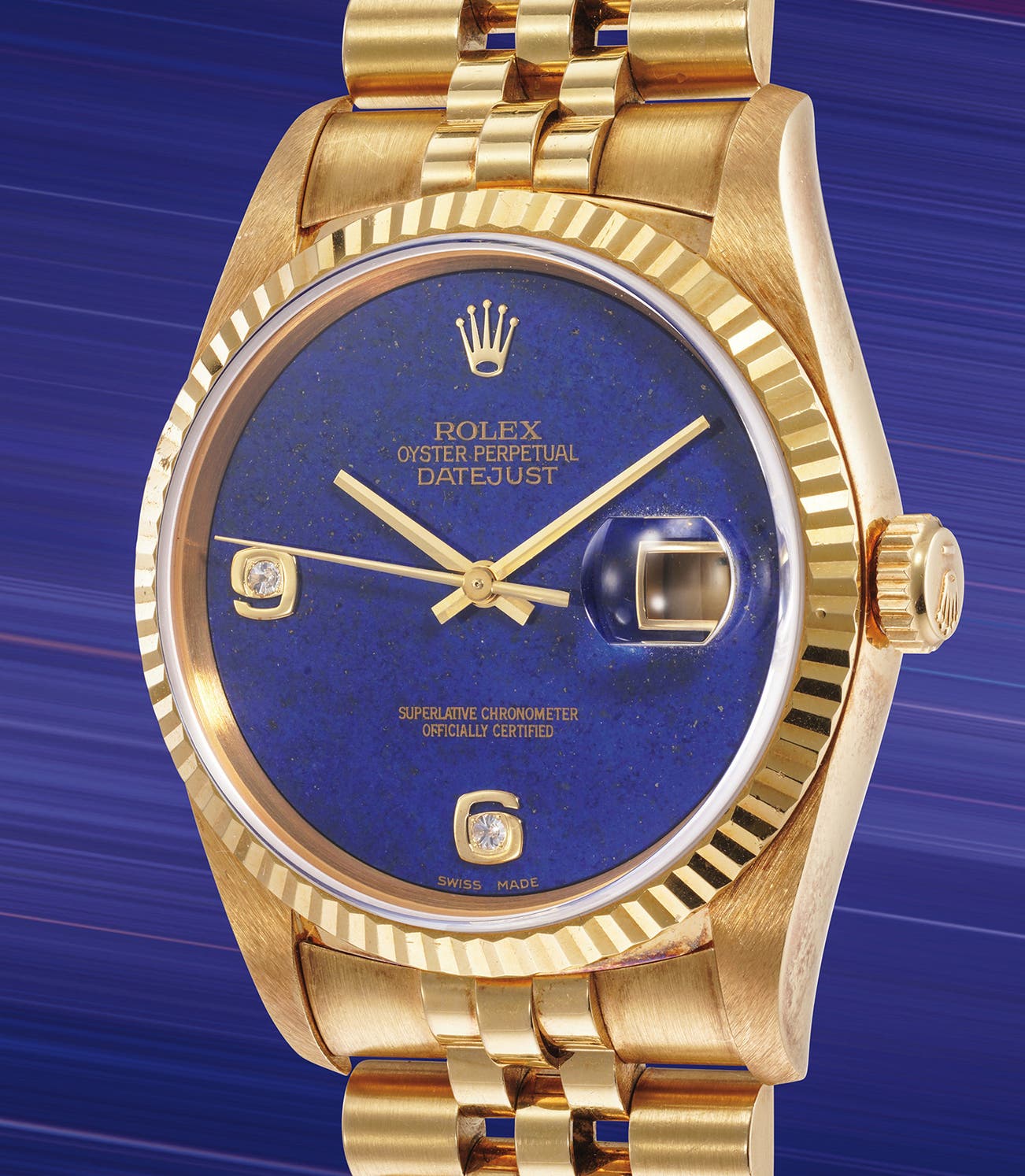 An extremely well-preserved and attractive yellow gold wristwatch with lapis lazuli dial, date, caseback sticker and bracelet