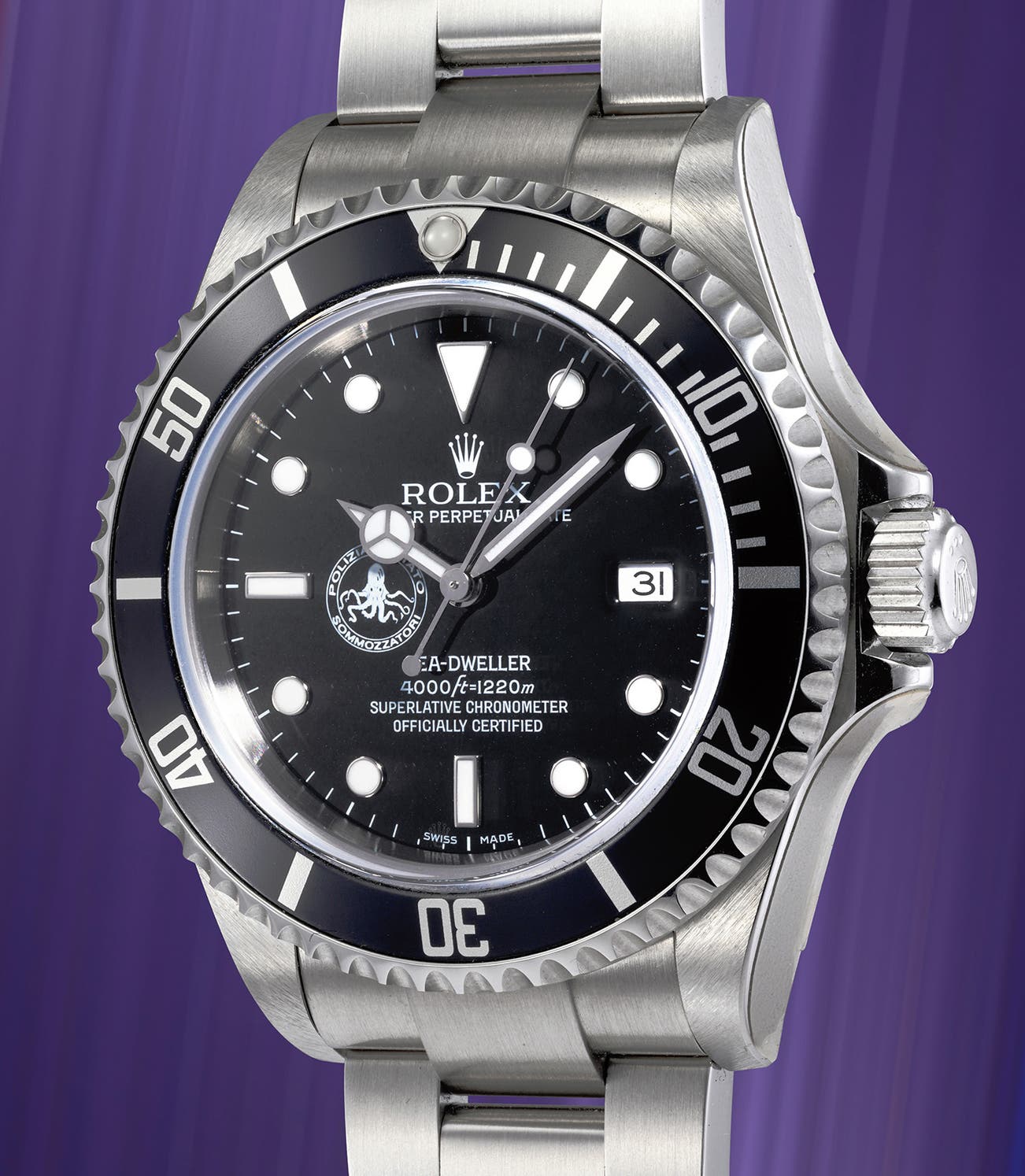 To celebrate the 50th anniversary of its diving corps, the Italian State Police asked Rolex to produce this rare special edition of 78 pieces. The emblem of the Italian Police Divers Corps - the octopus - is immediately apparent on the dial and is the origin of the "Polipetto" nickname for the model (Italian for "little octopus"). The caseback engraving is executed using high-voltage electro-gravure and it reads the commemoration "POLIZIA DI STATO SOMMOZZATORI 1958-2008”. Some examples additionally bear to the back the brevet number of the diver they had been assigned to, and 3 pieces reserved for the highest hierarchies of the Italian Police bear a bespoke engraving under the commemoration.