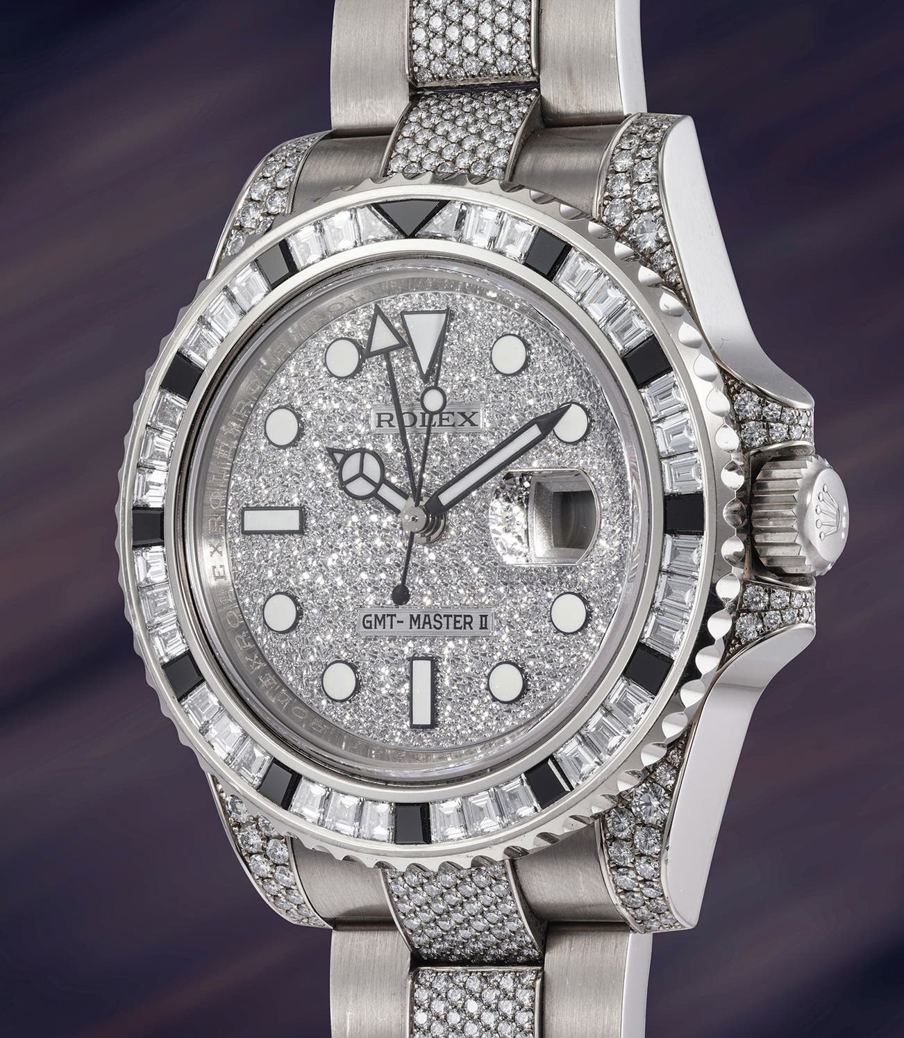 The present example is a variation on the theme, characterised by an incredibly striking monochrome appearance. As defined by its suffix “SANR”, the bezel of this piece is adorned with black sapphires (Sapphire Noir) and diamonds, which dramatically alter the overall looks of the piece. The colourful red/blue bezel in in this case exclusively black and white, granting to the watch both aesthetic boldness and ultimate readability (even more impressive in a gem-set piece).