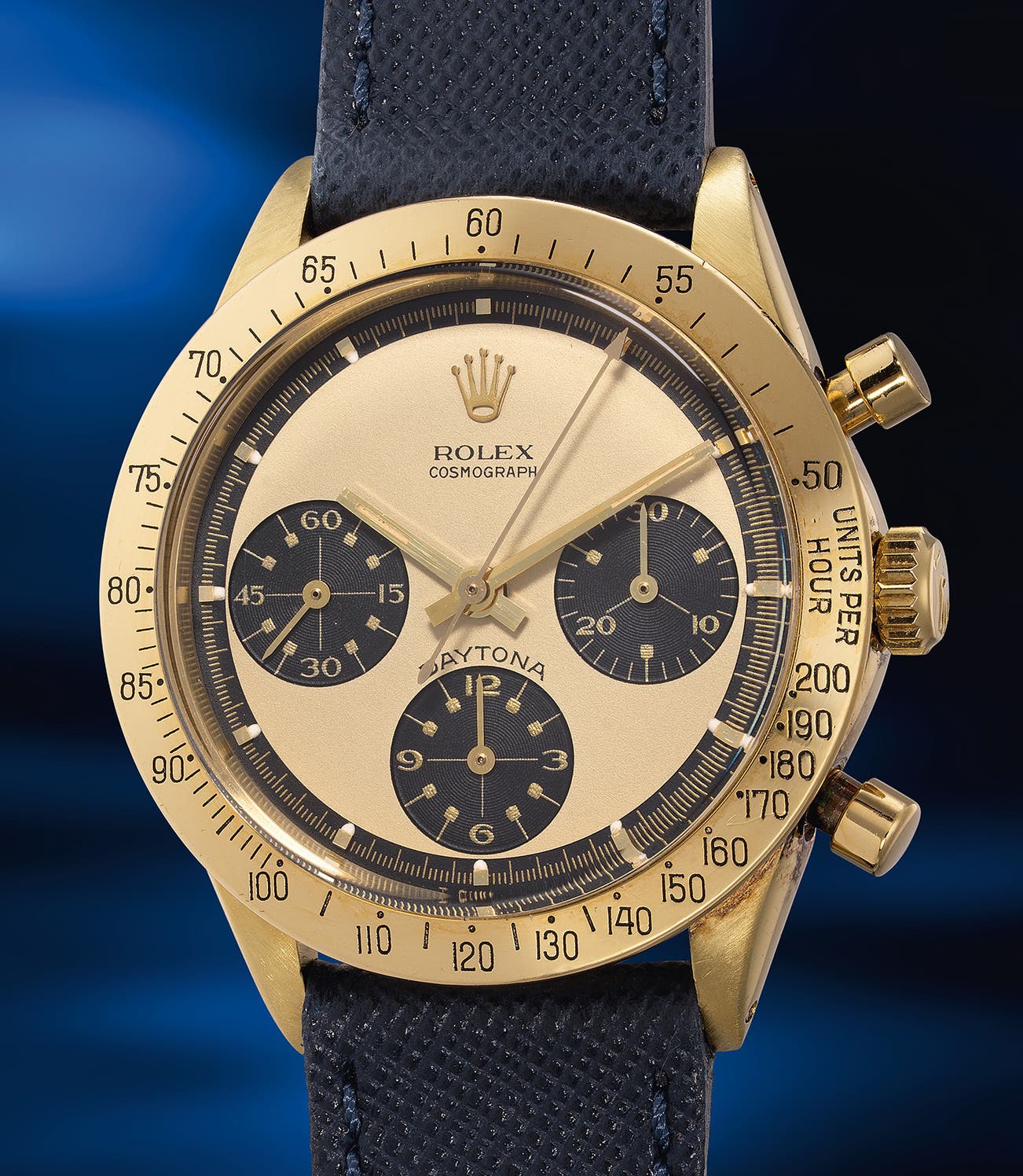 Featuring a champagne dial with gold graphics set within the sunken subsidiary registers, this timepiece was among the most luxurious Cosmographs available in the late 1960s. Glamorous and eye-catching, it exemplifies yet another variant of the beloved "Paul Newman" model.