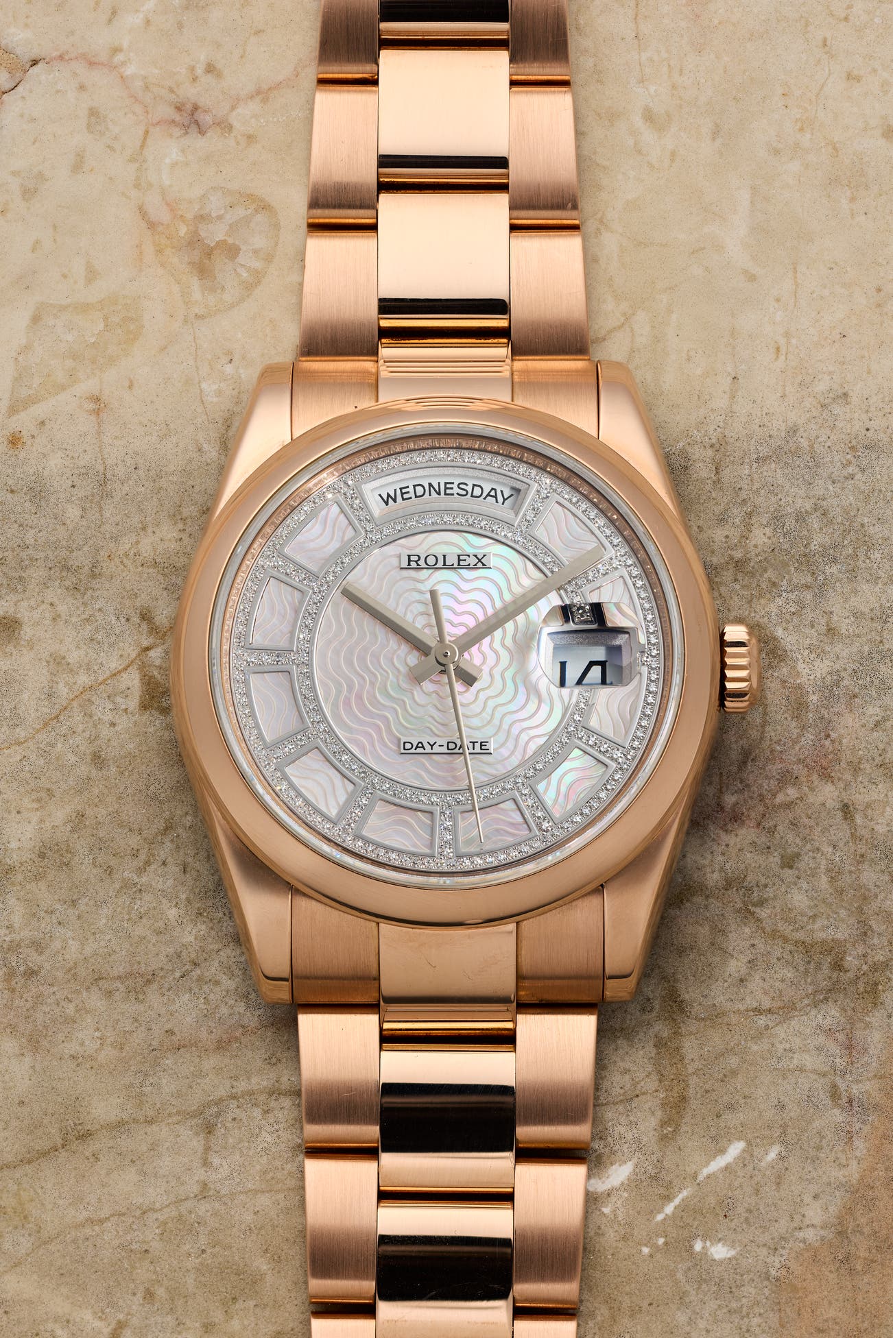 • Produced in the mid-late 2010s, the “Carousel” dial, here seen in pink mother-of-pearl engraved with a floral wave motif and with the hours being divided into diamond-set sectors (hence the nickname “carousel”). The dial perfectly compleemts the Everose gold alloy, and the smooth bezel and Oyster bracelet add a sportive look to the watch, contrasting beautifully with the delicacy of the dial.