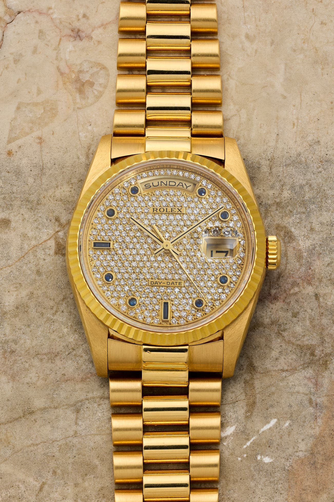 • This 18238 features the rare combination of a pavé diamond dial and sapphire hour indexes set within gold surrounds. The overall effect is restrained yet strikingly luxurious.