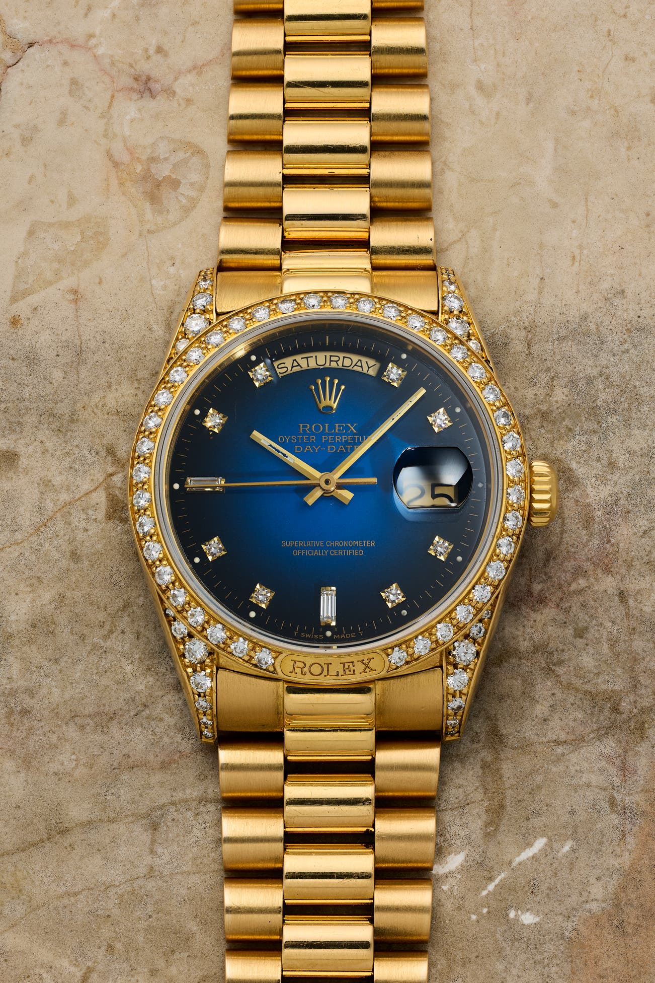 • The reference 18138 was produced for a relatively short period of time from 1985-1988, and often adorn with gems. The present Day-Date is distinguished by the “Rolex” brand name boldly engraved on the bezel’s edge at 6 o’clock. It is further highlighted by the wonderful blue “fumé” dial with gradient effect transitioning from the lighter blue center to the darker outer edge showcasing the diamond-set hour markers. A truly luxurious offering from Rolex, the diamond hour markers are complemented by the diamond-set bezel and lugs. This rare example presents an exciting opportunity to own one of Rolex’s most prestigious models.