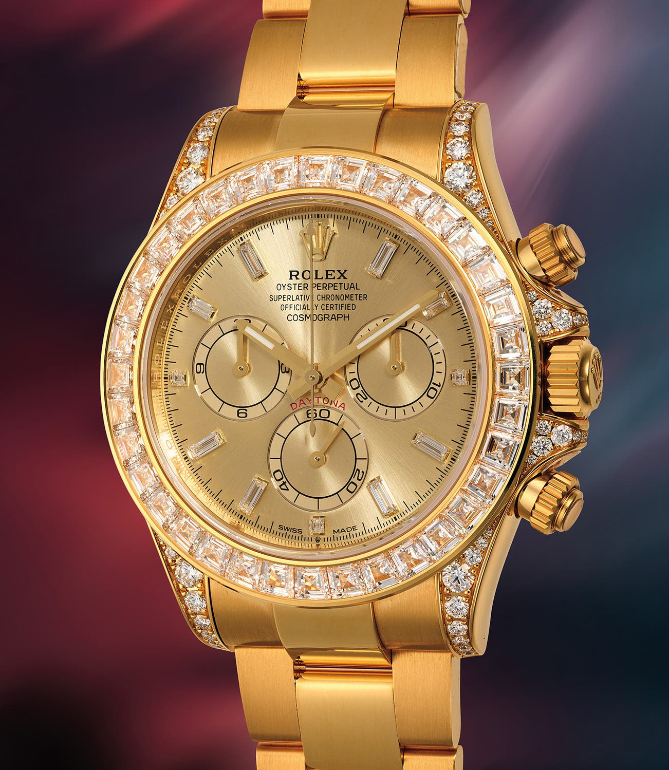 Introduced in 2024 with the updated caliber 4131 and reformatted dial layout, the reference 126598TBR is an extremely luxurious iteration of the coveted Daytona. The bezel is fitted with 36 trapeze-cut diamonds, all internally flawless, and the hour markers are baguette-cut diamonds. Each lug is set with round brilliant diamonds. Aside from the red text of “Daytona” above the 60 minute counter, each aspect of the 126598TBR has been Midas-touched with silky yellow gold and crowned in vibrant diamonds.