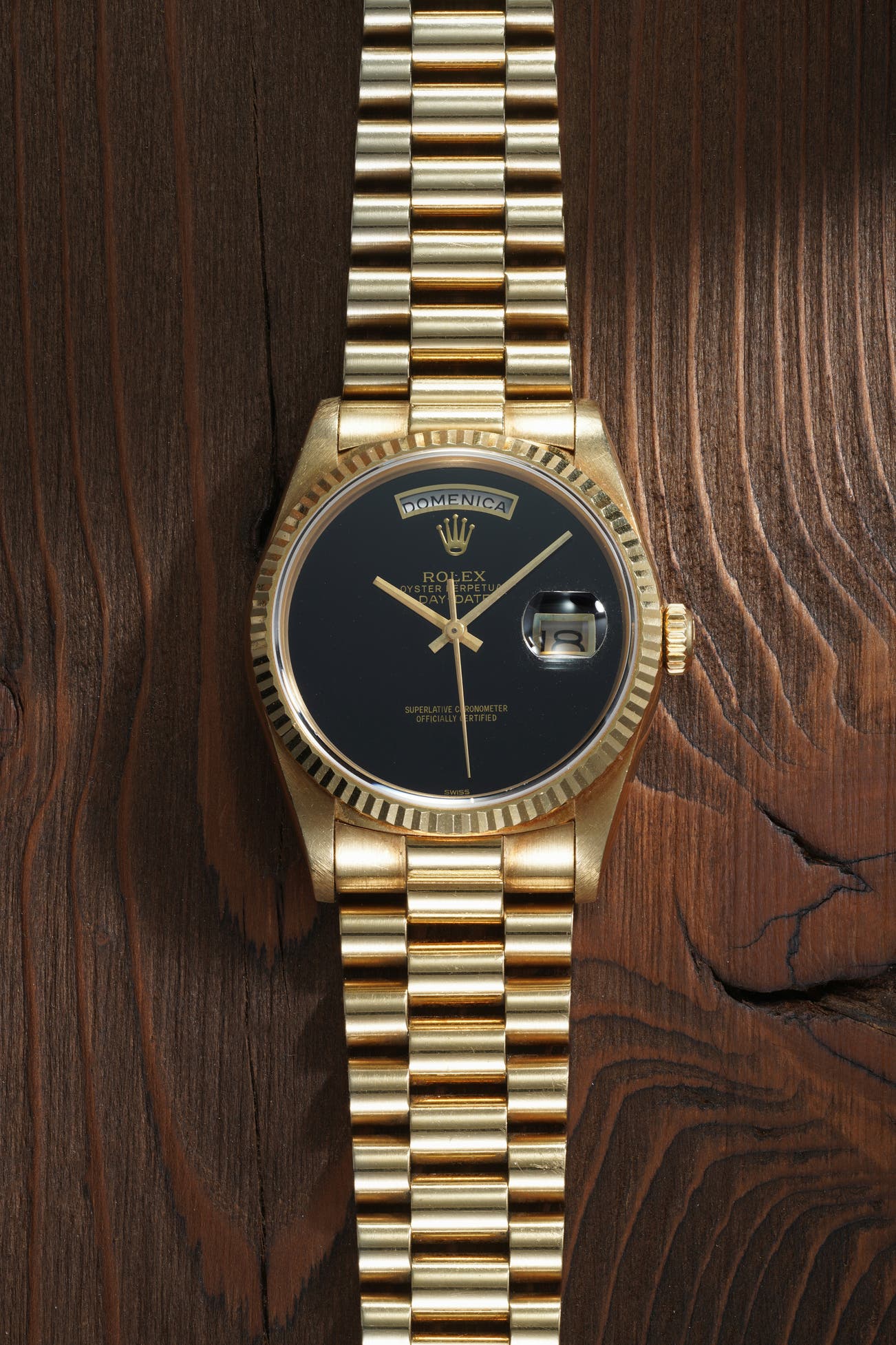 - Notably, the present example is fitted with an inky black onyx hardstone dial. Onyx, a form of chalcedony with deep banded layers, is a popular stone used in jewelry and watchmaking. Historically, Roman soldiers went into battle with onyx amulets for courage in battle, engraved with the visage of the god of war, Mars. The slice of onyx used for the dial of this Day-Date is utterly flawless, with attractive gilt printing.