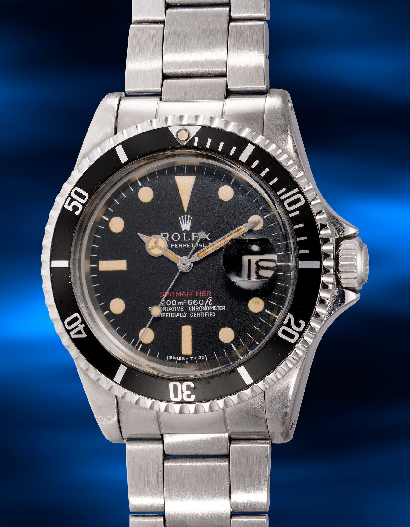 - Among the seven different iterations of "Red Submariner" dials identified by scholars in the watch community, this example is fitted with a rare and exceptional Mark I "meters first" dial produced between the 2.07 million and approximately 2.20 million serial numbers. It is distinguished by its elongated closed 6's, the distinctive overhanging "f" in the depth rating, and the red lettering of Submariner printed over white. Both the luminous material and the dial have aged beautifully, enhancing its vintage appeal. The lume plots and hands have developed a lovely light creamy hue, while the dial remains untouched and uniform.