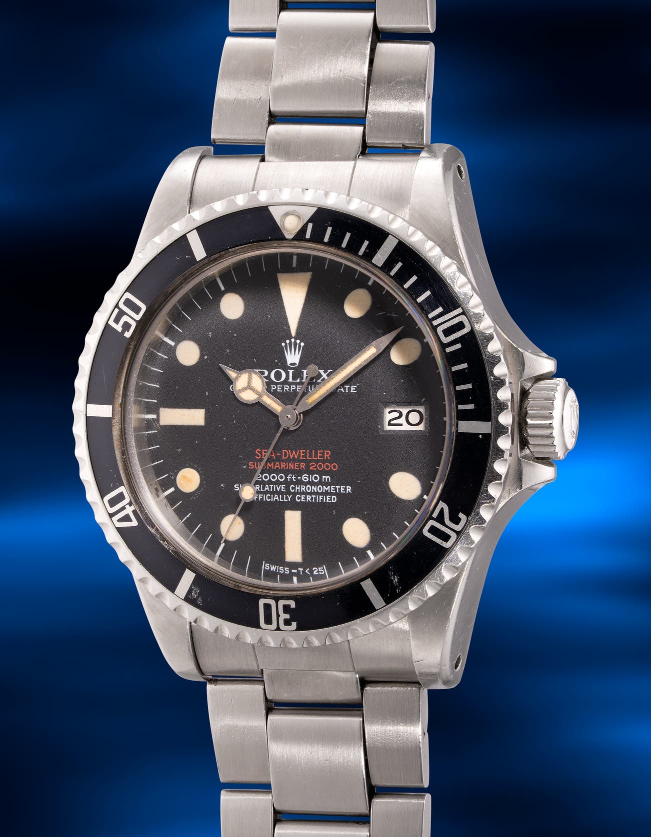 An attractive and rare stainless steel diver’s wristwatch with center seconds, gas escape valve, date, “Double Red MK III” dial and bracelet