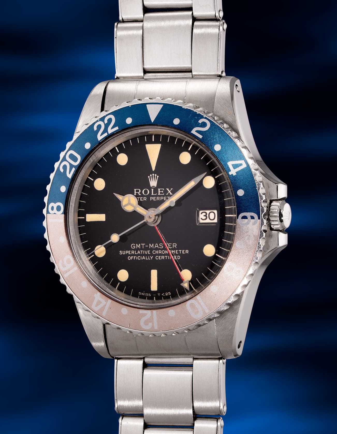 - The dial is beautifully preserved, retaining its glossy surface with luminous hour markers and hands that have aged to a warm yellowish hue. The period correct “Pepsi” bezel has also aged with an attractive patina to a faded pale pink retaining all its vintage charm, robustness, and reliability. The GMT-Master is truly a timepiece that stands the test of time and a perfect companion for any occasion.