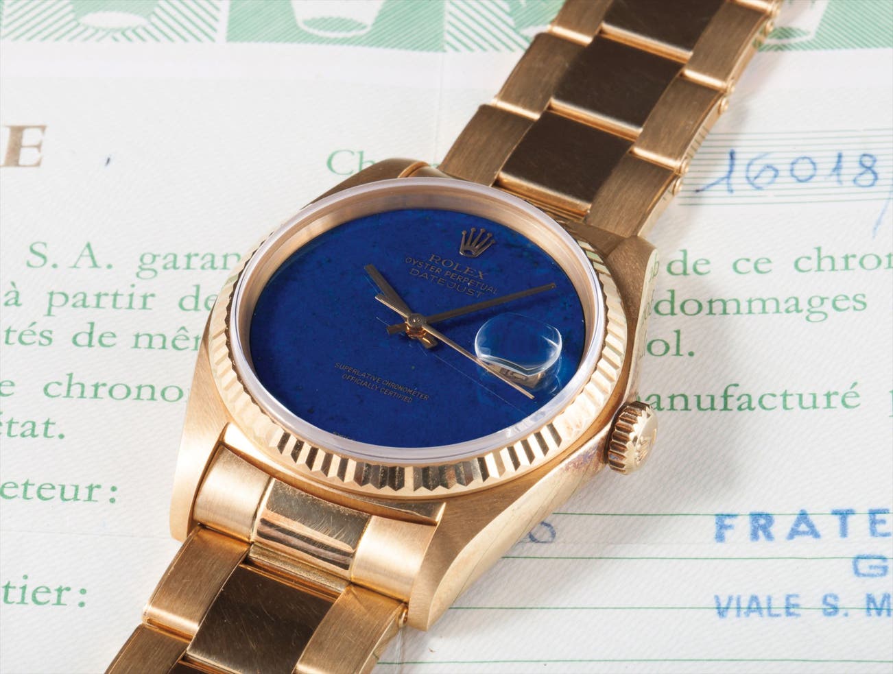 Rolex’s use of hard stone dials on Day-Date and Datejust models is recognizable by the gold frames used around the apertures on the dial.