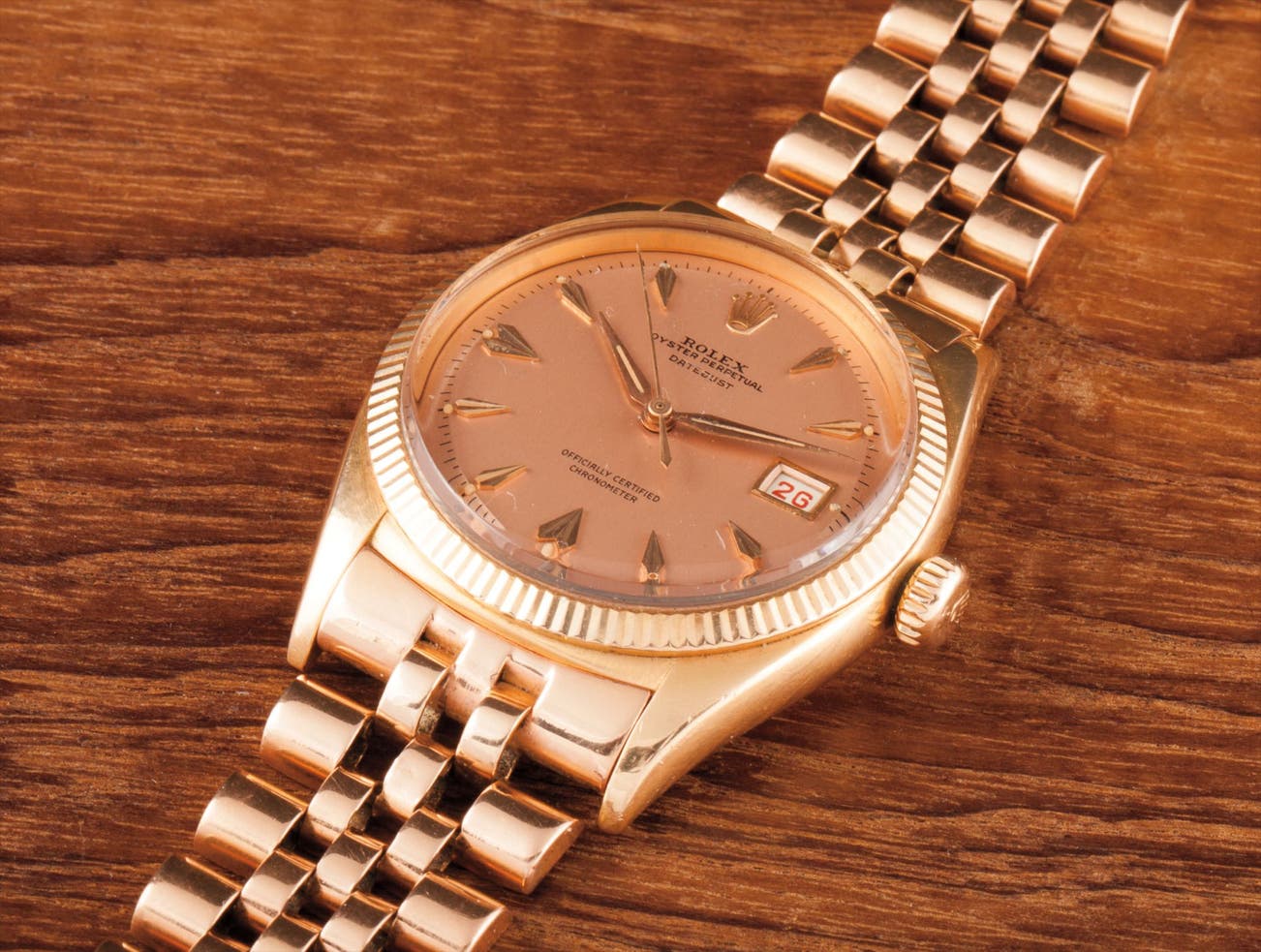 The subtle rose-coloured dial harmonises beautifully with the pink gold case and has substantial faceted spade-shaped hour markers. The date of the month is throughout in red, a typical feature for Rolex wristwatches during the mid-50s. The finely reeded bezel is the correct one for the period as is the jubilee bracelet dated 1953.