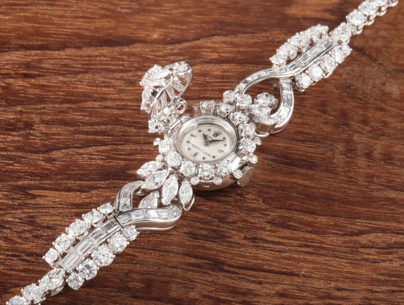 A very rare and attractive platinum and diamond set bracelet watch with concealed dial, retailed by Serpico y Laino