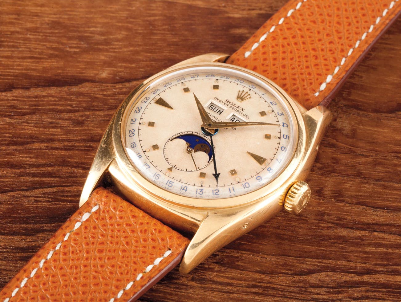 A very rare and attractive yellow gold triple calendar wristwatch with two tone luminous dial