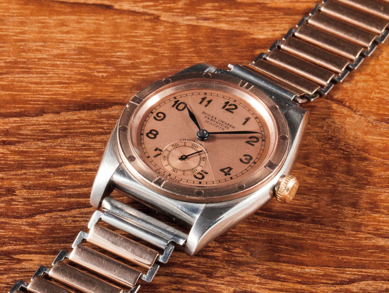 A very rare and attractive stainless steel and pink gold wristwatch with bracelet, two-tone dial and original box, retailed by Mappin & Webb