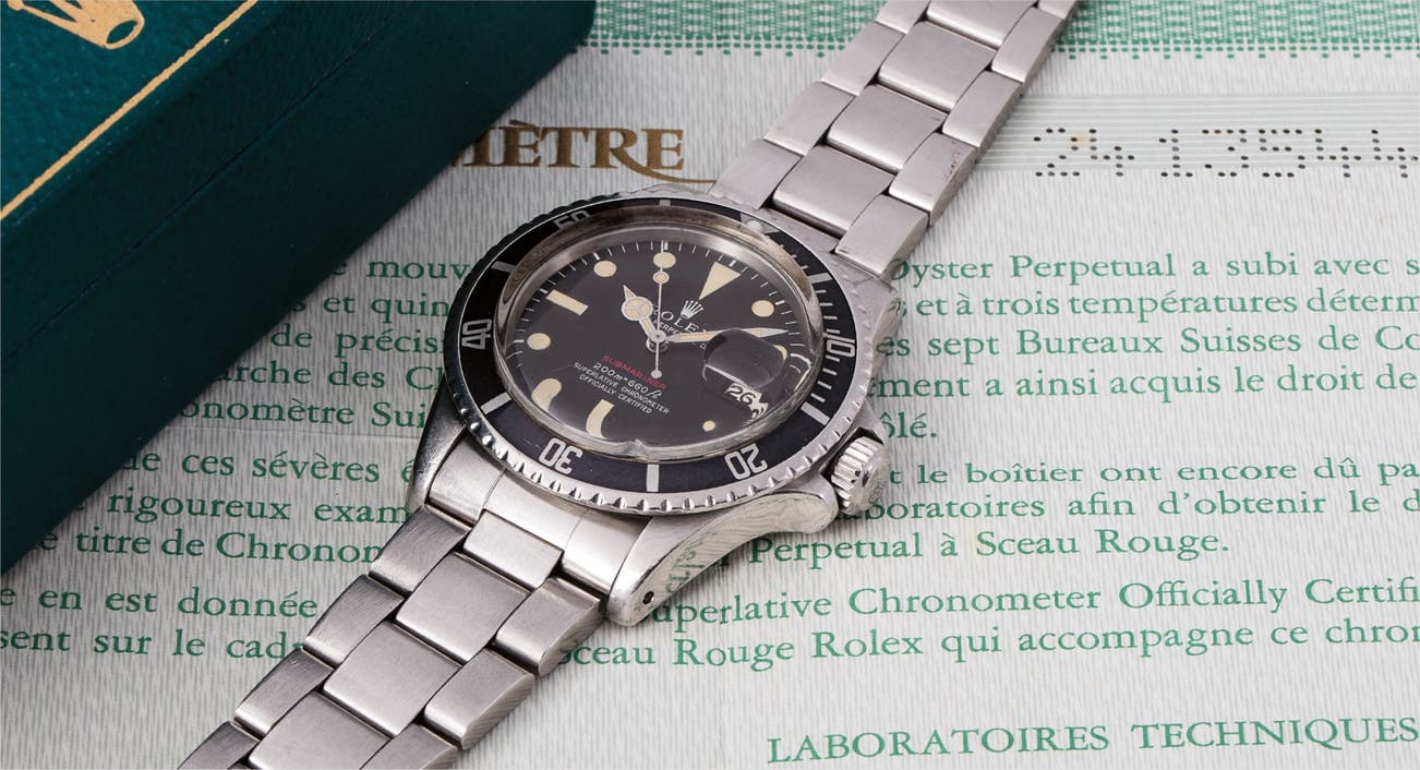 The present example is amongst the desirable earlier examples produced with a "meters first" depth rating, and a slightly so-called 'tropical dial', as there appears to be small hints of brown across its surface. Presented with box and papers, combined with the well-preserved case, this watch is a superb example of this highly desirable and collectible reference.