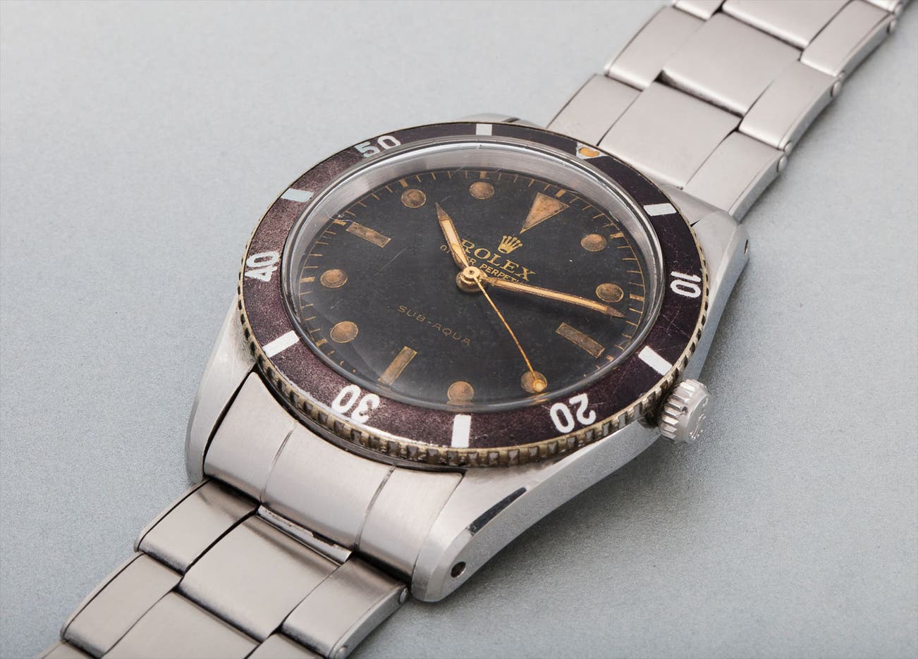 While still in the early experimental stages of the model, Rolex introduced many different dial designs and even model names, the rarest among these being the present Sub-Aqua. The Sub-Aqua name derived from the largest diver’s club named the British Sub-Aqua club, which was founded by ex-military personnel and is still in existence today. Reference 6204 was the brand’s first true diving watch, water resistant to 100m, and the first of the Submariner family. These early, experimental models are especially coveted by collectors.