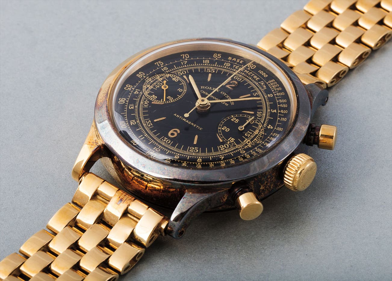Rarely ever seen, this watch developed a beautiful gunmetal mirrored finish as it oxidized, adding such a pleasing aged appearance to the watch. The completely unrestored black dial features gilt text with both a tachometer and telemeter scale with “Fab Suisse” written on the lower edge of the dial by 6 o’clock. The yellow gold Rolex bracelet in superb condition is just the cherry on top of this unbelievable work of art.