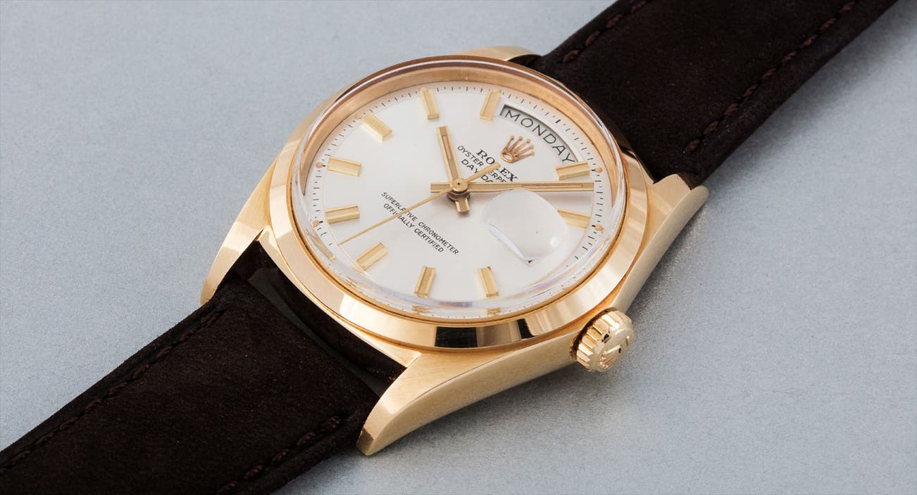 The overall stunning looks of this Rolex Day-Date are complemented by the correct matching “Wide Boy” hour and minute hands. This watch is very attractive, and offers great value and tremendous charm.