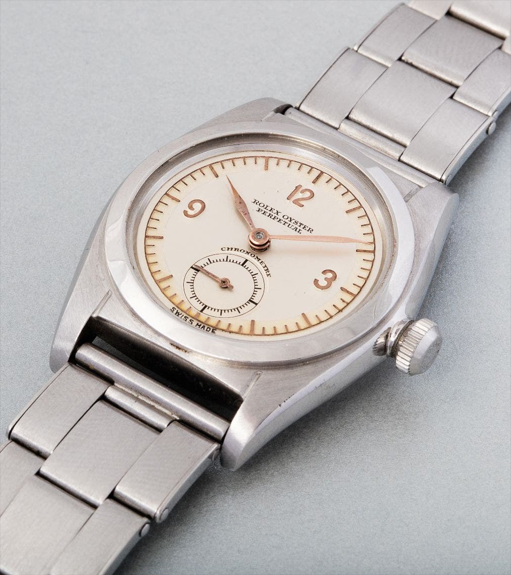 A closer look at this special dial shows that all of its indications – the hour markers and minute track - are embossed, and the relief is painted in copper color, giving the dial a wonderful sense of depth. The case and original bracelet are in virtually perfect condition and show no traces of polishing. The expandable bracelet is still very tight and presents the original satin finish. The original S.A.R. engraving on the clasp and the early Rolex logo on the case back are crisp and perfect, as it left the factory nearly eight decades ago. The domed crystal has crackled, which is very common with this type of material, but appears to be the original one. Despite its rather compact diameter of 31mm, the "Bubbleback" has a masculine presence on the wrist and offers the same satisfaction that larger and more costly collector’s watches are known for.