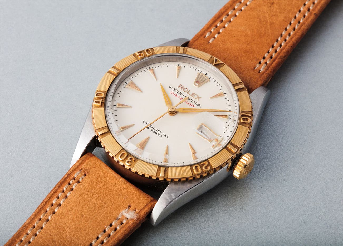 The first catalogues advertised these watches with the image of the U.S. Air Force demonstration flying team, ‘The Thunderbirds’ and the watch quickly adopted the nickname. This particular watch also features the caliber A.296 movement, a variant of the movement usually found in the Rolex "Bubbleback", but which was only produced from 1950 until around 1955. The watch also retains its wonderful original Brevet crown and sports the crisp red "Datejust" designation text towards the centre.