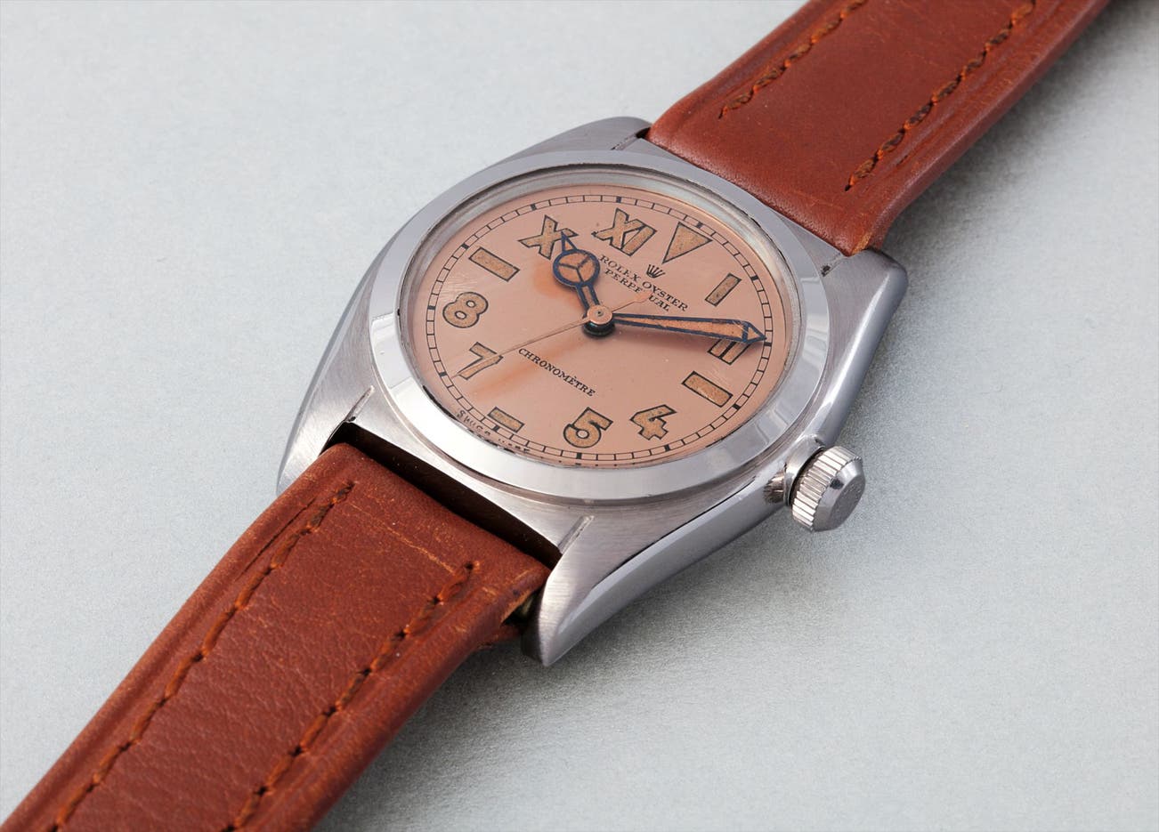 This particular watch is an excellent example of an Oyster Perpetual wristwatch, featuring a stainless steel case and a highly attractive pink "California Dial". The condition of the present "Bubbleback" is close to mint, and it appears that the watch has possibly never seen any wear. In fact, it still retains its original period calf leather bracelet stamped underneath "ROLEX", but also the unrestored dial shows burn marks caused by the luminous hands not having moved in years, if not decades.