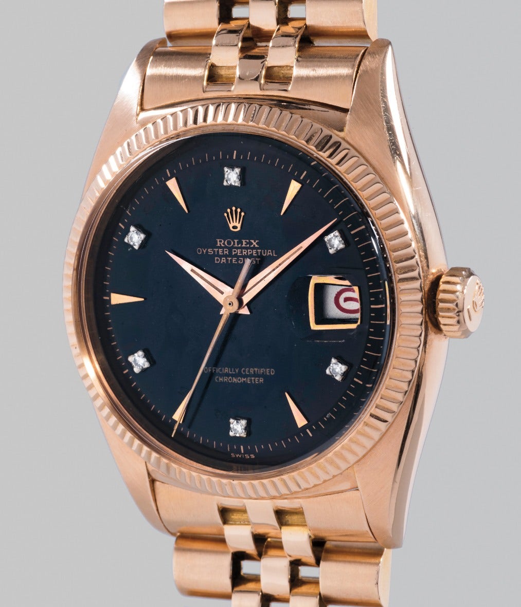 The Datejust has seen an extraordinary multitude of dial variations, case materials and finishes. The case of the present watch is made of pink gold and displays elements of the classic and easily identifiable Rolex DNA that has made the brand so famous.