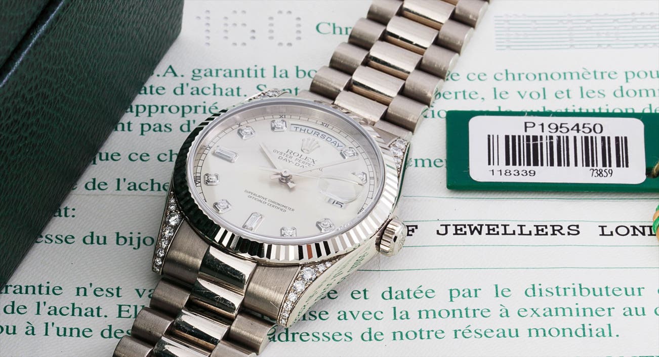 The reference 118339 was created in the early 2000s, and in this instance, was originally sold in London. The present example is encased in white gold, making this watch rare and desirable. The shimmering silvered sunburst dial is adorned with gold applied diamond hour markers and crisp lugs that are also accented with diamonds.