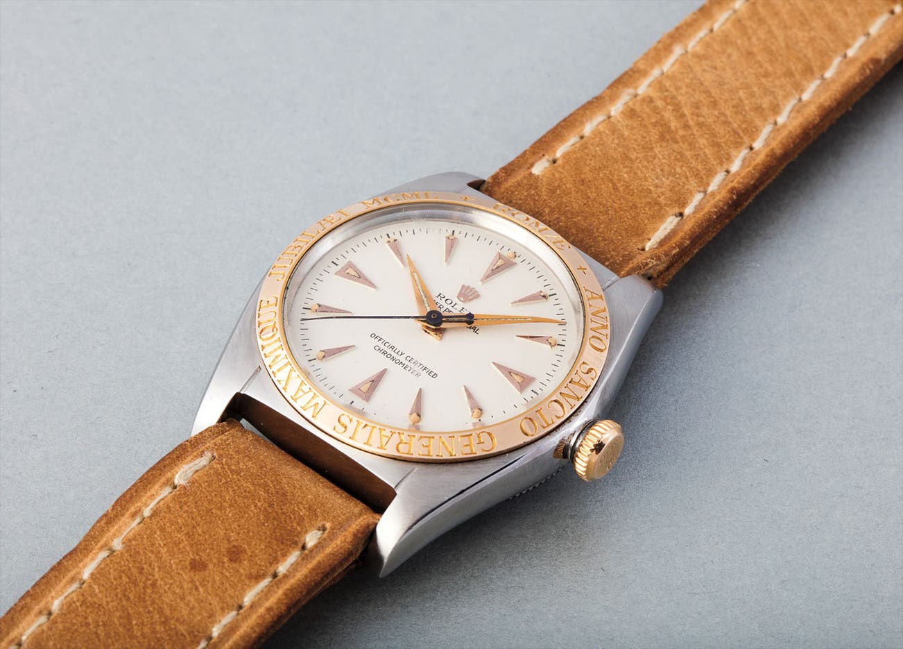 It goes without saying that the present "Anno Sancto" reference 5010 is one of the rarest Rolex watches. Its close to mint condition, still retaining its period Rolex calf leather bracelet and buckle further adding to the exclusivity of the present "Bubbleback".