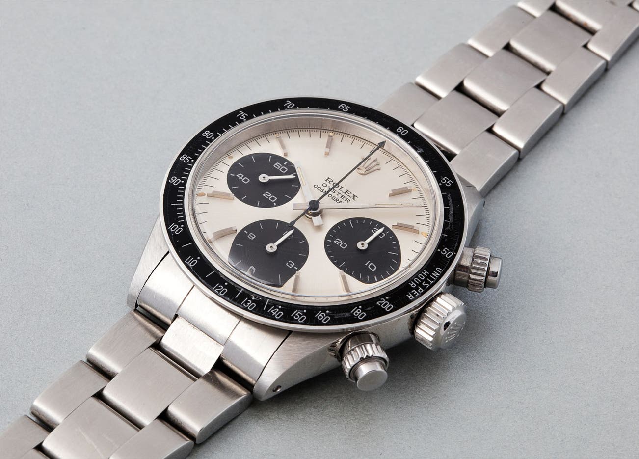 The present Cosmograph is a fascinating example of this reference; the dial is in very good condition and the case retains very good definition to all angles, proof that it has not been over polished. The most noteworthy particularity about this example here are the oversized subsidiary dials, larger than those found on most other examples of reference 6263. What may initially appear to be a very small and subtle difference, changes however the appearance quite considerably. As a result, Rolex Cosmograph collectors have named this rare variant “Big Eye”.