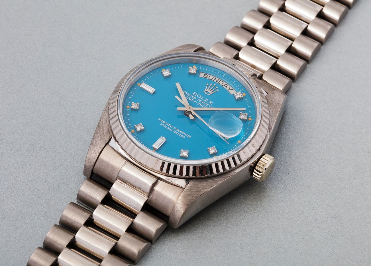 The current example is extremely well preserved, and kept in overall excellent condition. The rarity of the “Stella” colored dial combined with the diamond hour markers, silvered text and the condition of the white gold case and bracelet results in an extraordinarily striking, yet elegant look.