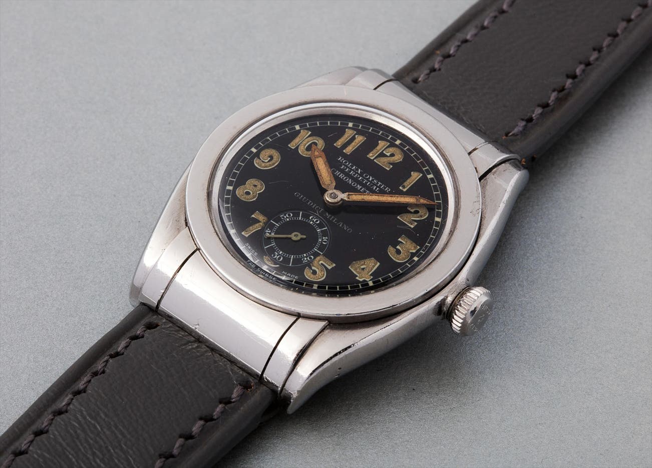 A very rare and fine stainless steel wristwatch with black dial, luminous numerals and hooded lugs, retailed by Giudici Milano