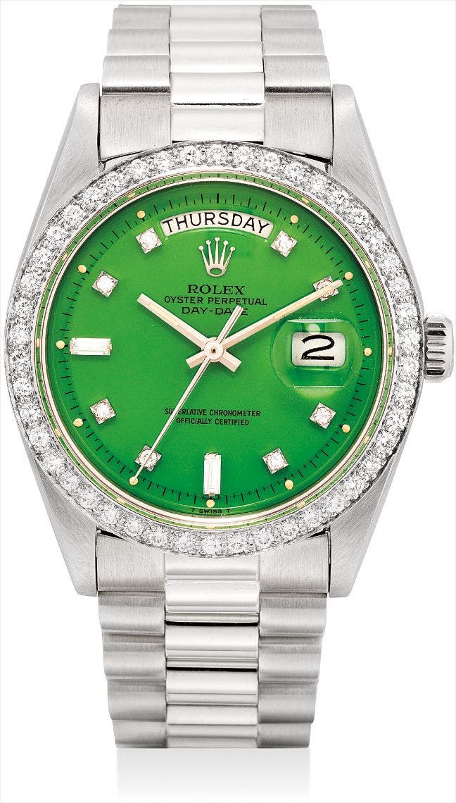 A very fine and rare white gold and diamond-set calendar wristwatch with sweep centre seconds, apple green lacquer 'Stella' dial and bracelet