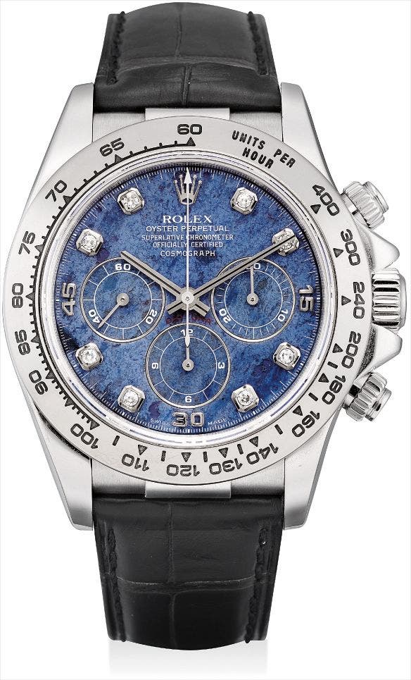 A fine and rare white gold and diamond-set chronograph wristwatch with sodalite hardstone dial