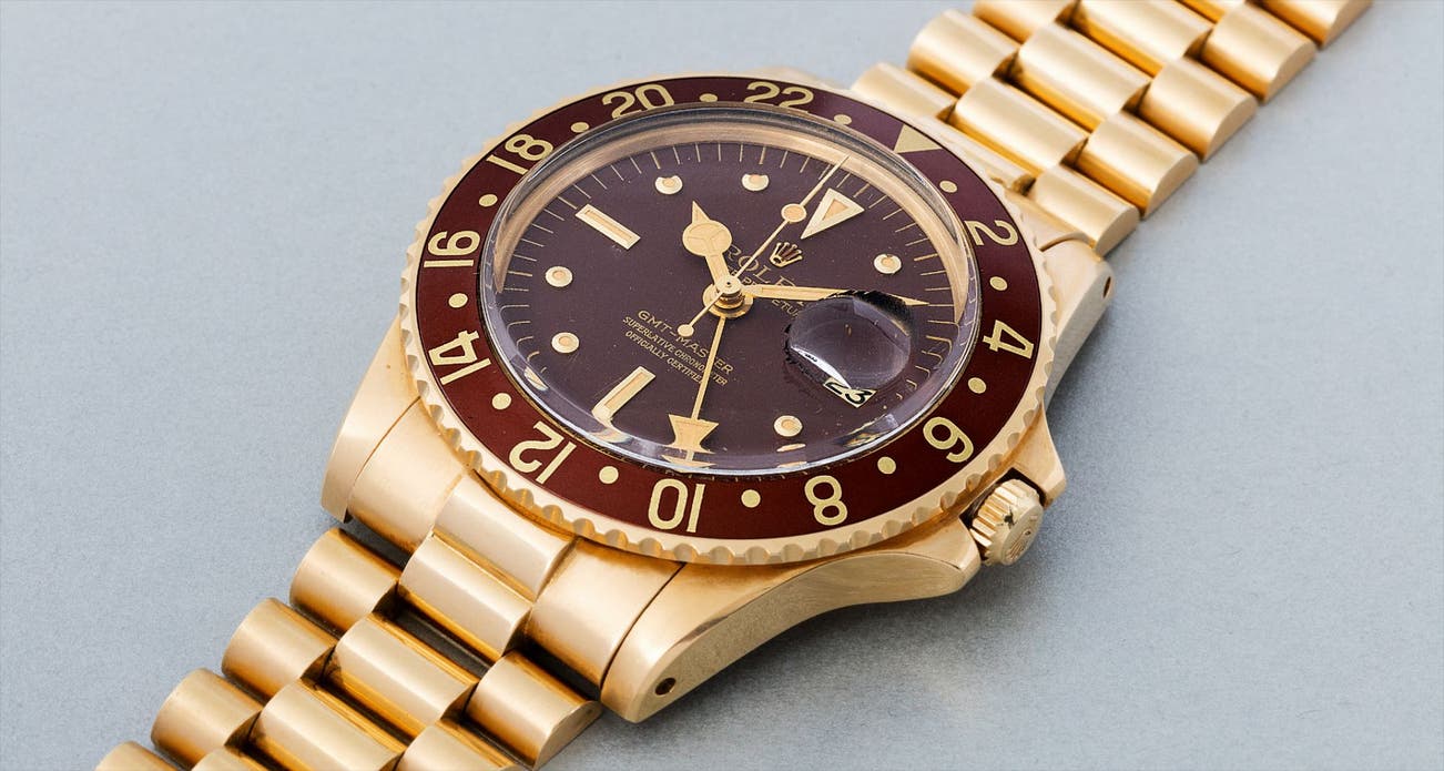 The present example features a brown dial with nipple-shaped, luminous hour markers and a matching brown bezel that provide a warm harmony of color together with the gold case. This watch is presented with an original Rolex President bracelet – highly unusual for a GMT-Master – that has aged beautifully. Combined with its overall excellent condition, it’s a versatile watch offering great wearability and style for a collector of vintage Rolex sport watches.