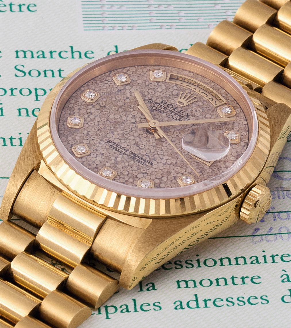 Rolex pushed its limits once again when offering in the early 1990s the present reference 18238 “Jurassic Park” with its extraordinary dial carved from a petrified fossil. It is indeed difficult to imagine how complicated it is to carve a slice out of such a fragile stone, and then to drill the holes required to mount the ten diamond hour markers. Adding even more appeal to this rare watch, it’s presented in superb condition with hardly any signs of wear, even retaining its original green sticker on the caseback. Accompanied by its original punched guarantee, this watch is as good as it could get for a collectible, modern Day-Date.