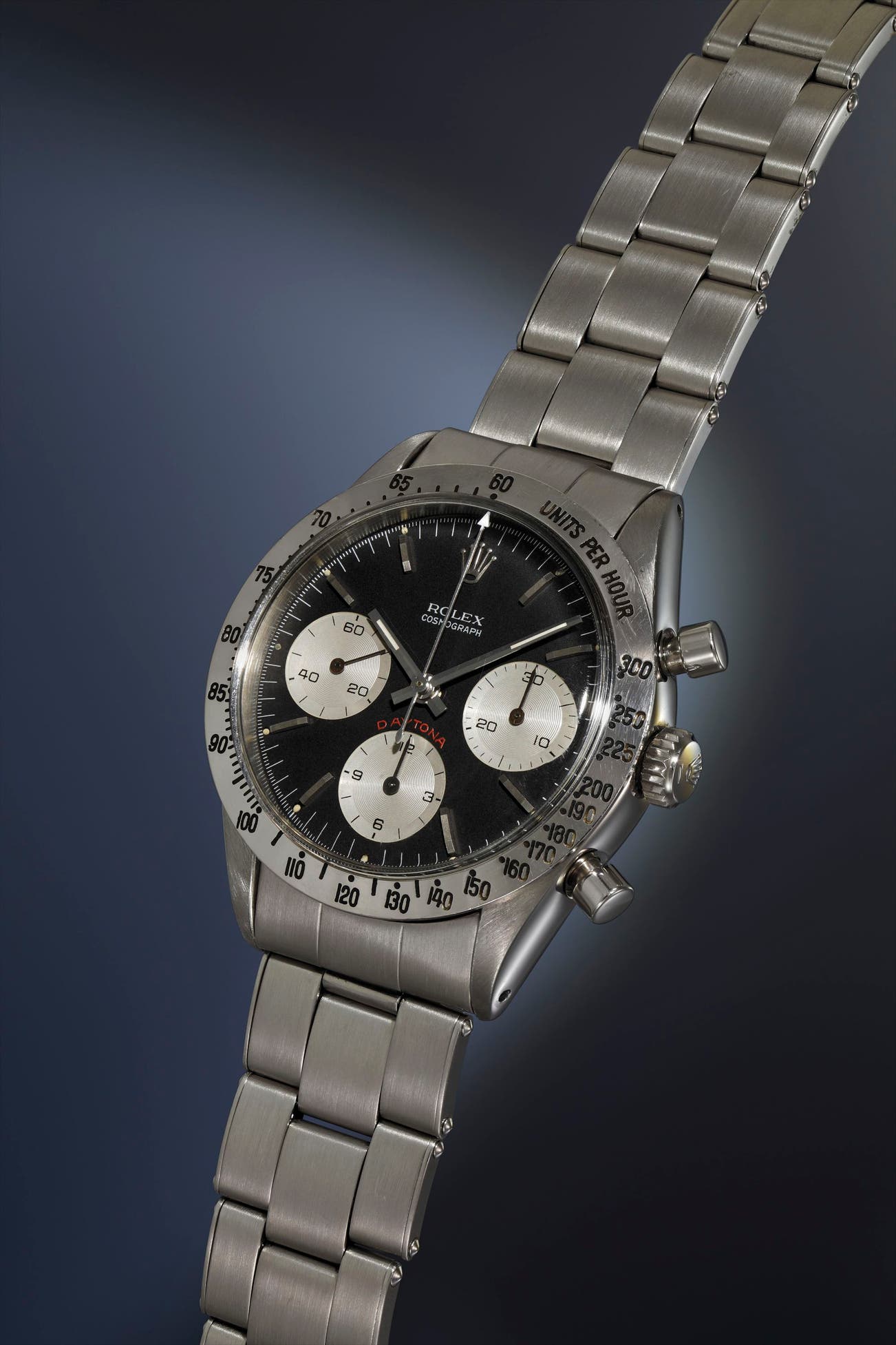 The present, early example is fitted with a beautiful black matte dial and silvered sunken subsidiary dials, with the highly desirable, red ‘Daytona’ printed above the 6 o’clock subsidiary dial. Interestingly, the visibility of the “T-SWISS-T” designation on this unusual dial is completely obstructed by the case. When the dial is carefully removed from the case, as seen in the image on the left, one is able to admire this subtle detail. The early original bezel, calibrated to 300 units per hour, remains in place, adding to the collectibility of the piece. Completed with a gorgeous, riveted Rolex Oyster bracelet, it is presented in overall excellent condition.