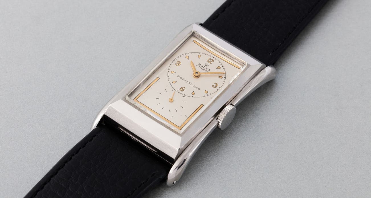 This stunningly attractive Prince is a very rare and coveted reference 1490 ’Wide Brancard’ variant. In stainless steel, it features ‘stretcher’-style gold borders on its two-tone dial, but impresses most of all due to its oversized, flared case. It is believed to be one of the last examples of the Prince models made by Rolex.