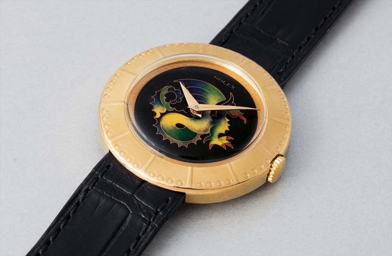 An extremely rare, important, and highly attractive yellow gold wristwatch with cloisonné enamel dial depicting a dragon