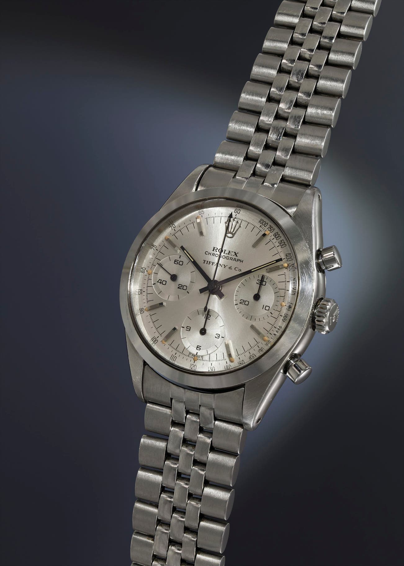 Consistent with the condition of the dial, the case is preserved in remarkable overall condition, illustrated by its sharp bezel, strong definition of the lugs, crisp numbers in between the lugs, and the engraved 4-digit Tiffany code on the underside of the lug. It’s completed with its correct and original Rolex U.S.A. Jubilee bracelet – in accordance with the watch’s sale in NY in 1964. This exclusive example of a Tiffany-signed “Pre-Daytona” is a truly rare opportunity for the discerning collector.