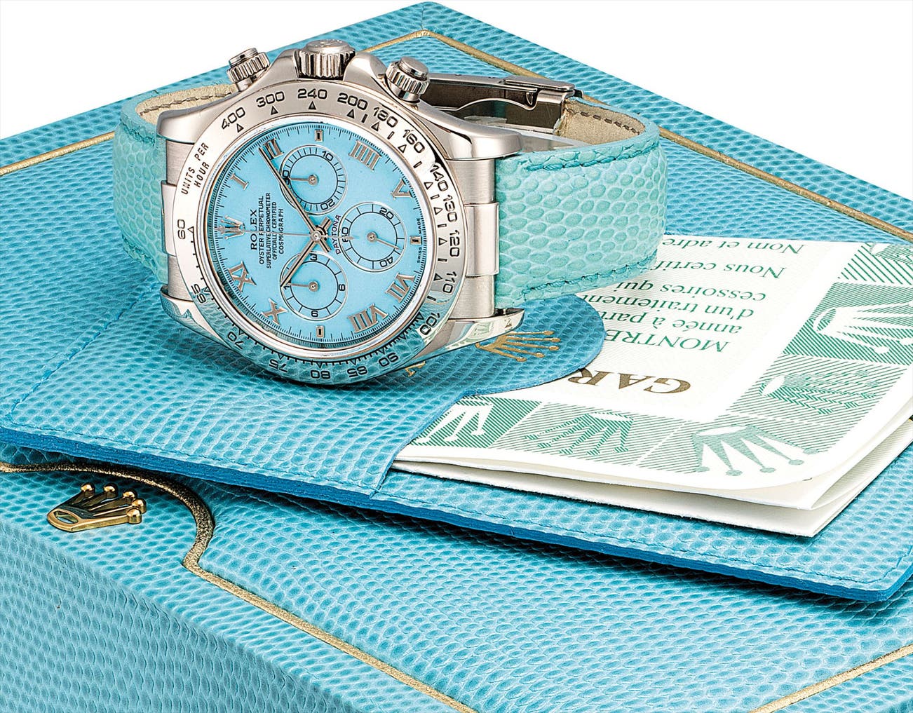 A fine and rare white gold chronograph wristwatch with turquoise dial, guarantee and fitted presentation box