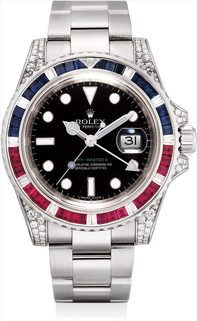 A fine and rare white gold, diamond, sapphire and ruby-set dual time wristwatch with sweep centre seconds, date, bracelet, guarantee and fitted presentation box