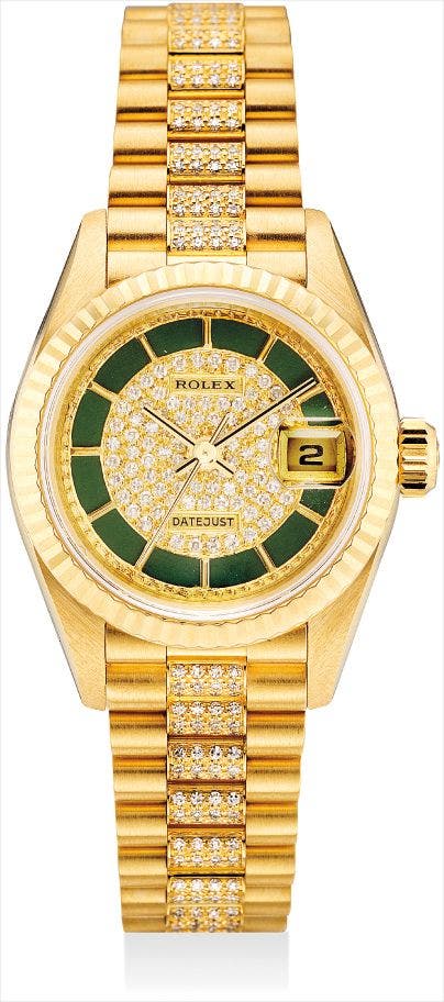 A lady's very fine and rare yellow gold and diamond-set wristwatch with sweep centre seconds, date, enamel dial, bracelet and guarantee