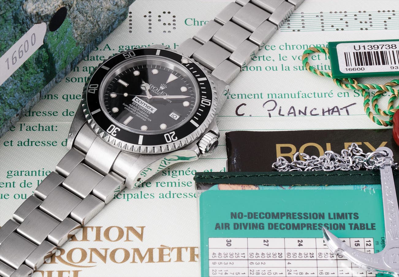 All original, the present watch is presented today in excellent condition and is accompanied with an impressive number of accessories: its original box, Rolex guarantee, hang tags, the Rolex anchor, product literature and is further accompanied by documentation describing the Hydra-Ludion missions, as well as other COMEX diving equipment its original owner used. All of these elements make it a unique opportunity to add a rare variant of the coveted “Comex" Sea-Dweller to one’s collection.