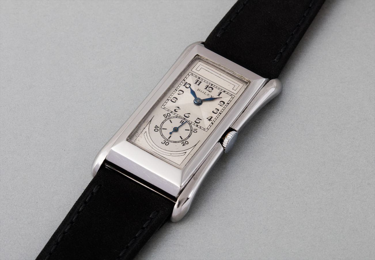An extremely rare, highly attractive and oversized rolesium rectangular doctor's wristwatch with flared sides and two-tone dial