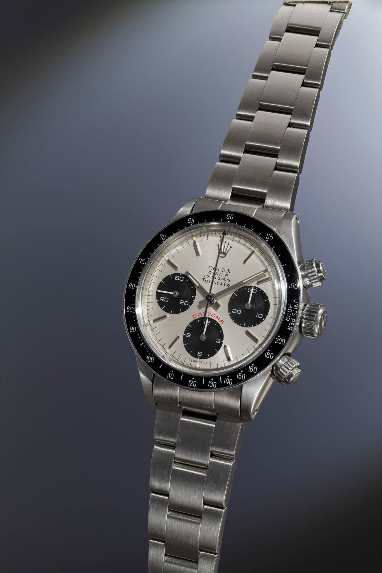 References 6263 and 6265 were both launched in 1969, replacing the first Oyster Cosmograph model, reference 6240. The stainless steel model with screw-down pushers was in production for almost 20 years. Bearing serial number 6’393’159, this lot was manufactured in 1980. Fitting a silvered dial with black sub-dials and its correct black acrylic bezel, the combination creates an eye-catching contrast with the steel case. Found beneath the “Oyster Cosmograph” script at 12 o’clock is the prestigious “Tiffany & Co.” retailer signature printed in black.
