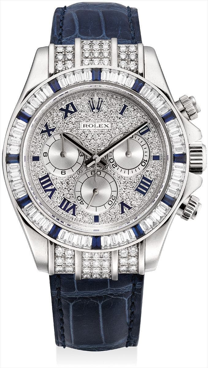 A fine and very rare white gold, diamond and sapphire-set chronograph wristwatch
