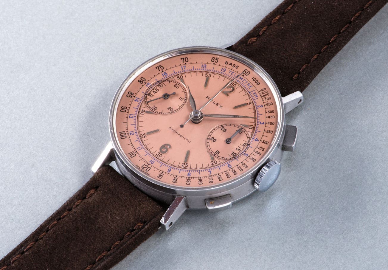 A very rare and attractive stainless steel chronograph wristwatch with salmon colored dial, tachymeter and blue telemeter scales